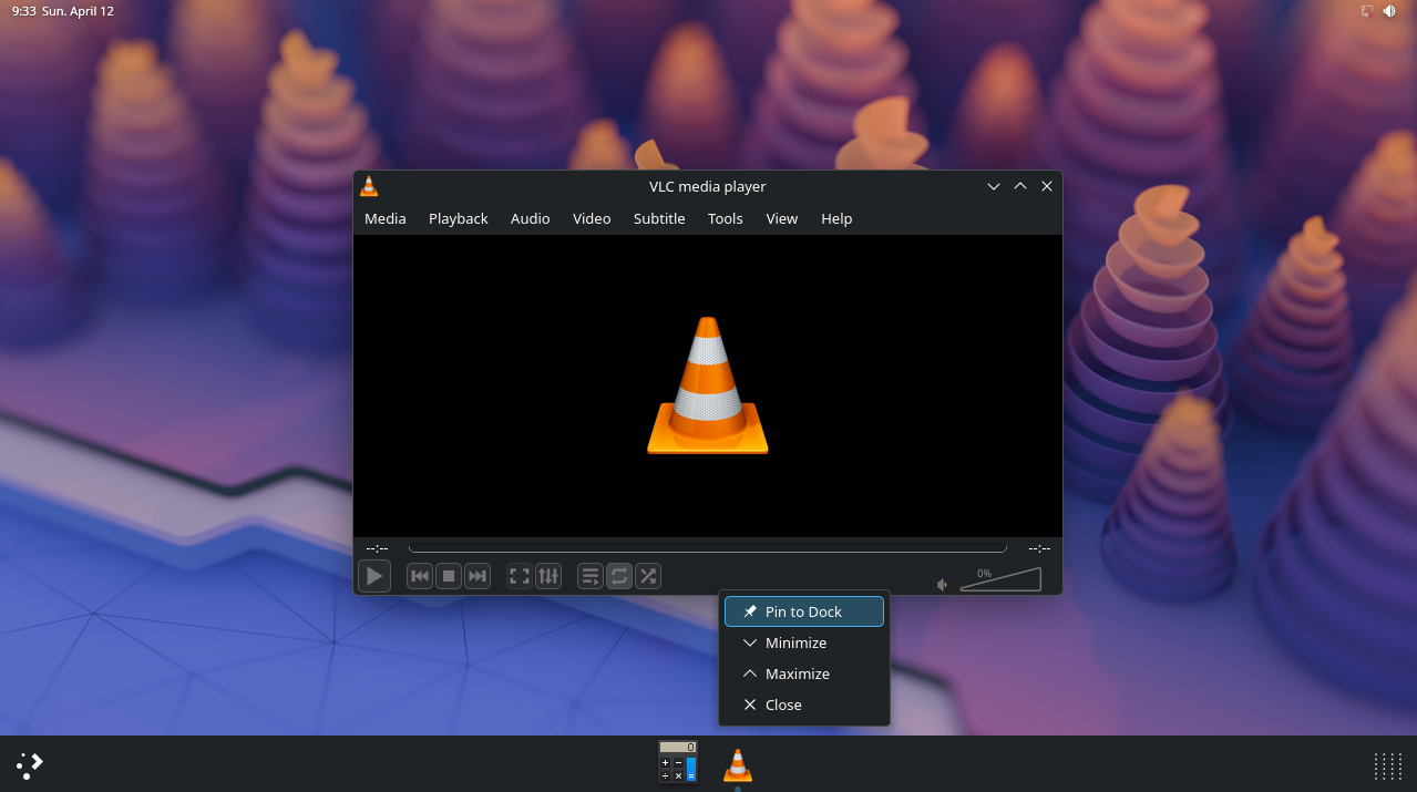 Navigation panel replaced by a dock with running-app indicators, favourites, context menus, and hover tooltips